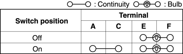 1. Verify that the continuity between the hazard warning switch terminals is as indicated in the table.