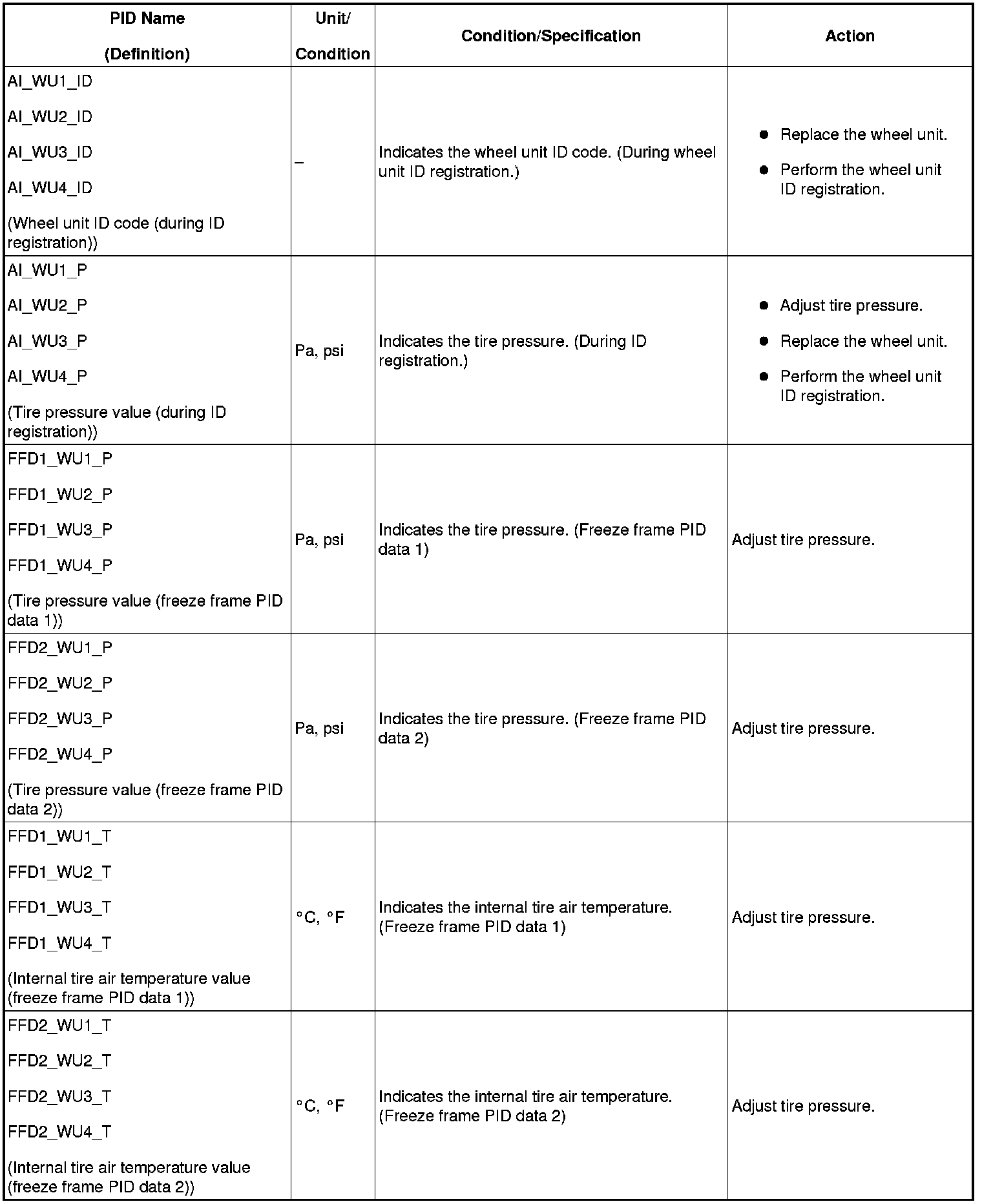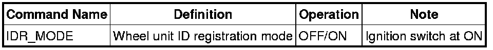 Data transmission from the wheel unit occurs when the vehicle speed is 25 km/h {15.5 mph} or more. Due to this, the current air pressure and temperature data can only be displayed after the vehicle is driven at 25 km/h {15.5 mph} or more. Also, the ID_LAST, and tire pressure and internal tire air temperature data are erased when the instrument cluster connector and the battery terminal are disconnected. If the instrument cluster is replaced or the battery terminals are disconnected, drive the vehicle at 25 km/h {15.5 mph} or more and display the tire pressure PID after the data transmission.