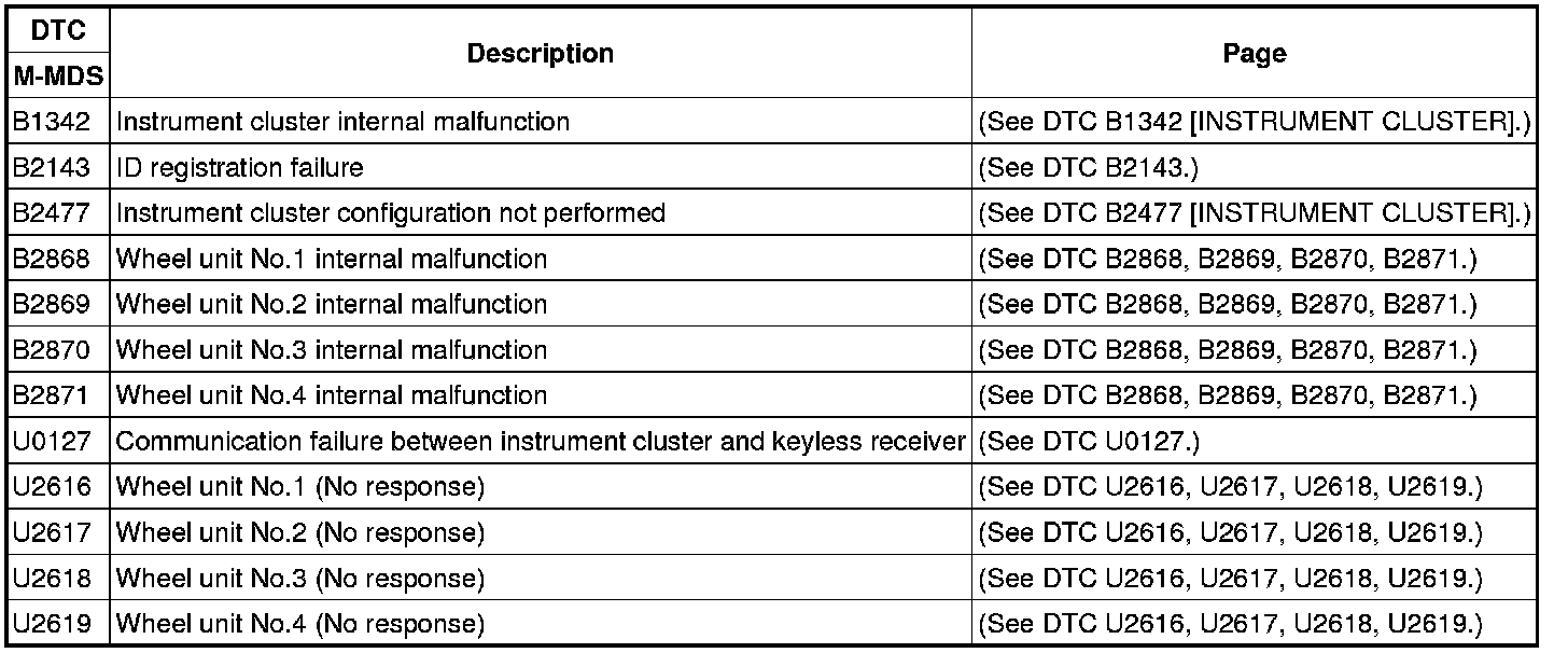4. After completion of repairs, clear all DTCs stored in the instrument cluster. Instrument Cluster - DTC Table