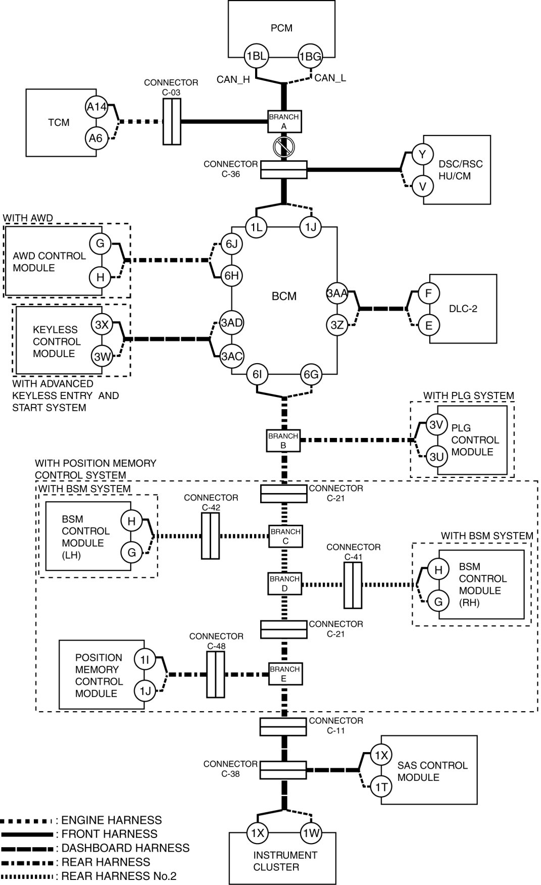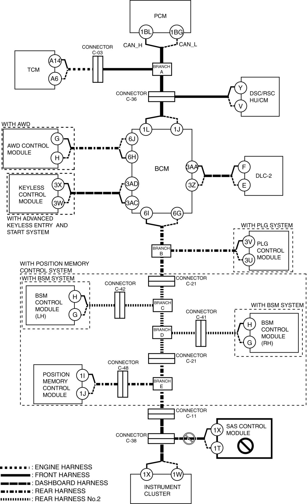 - Wiring harness between BCM terminal 1L and connector C-36