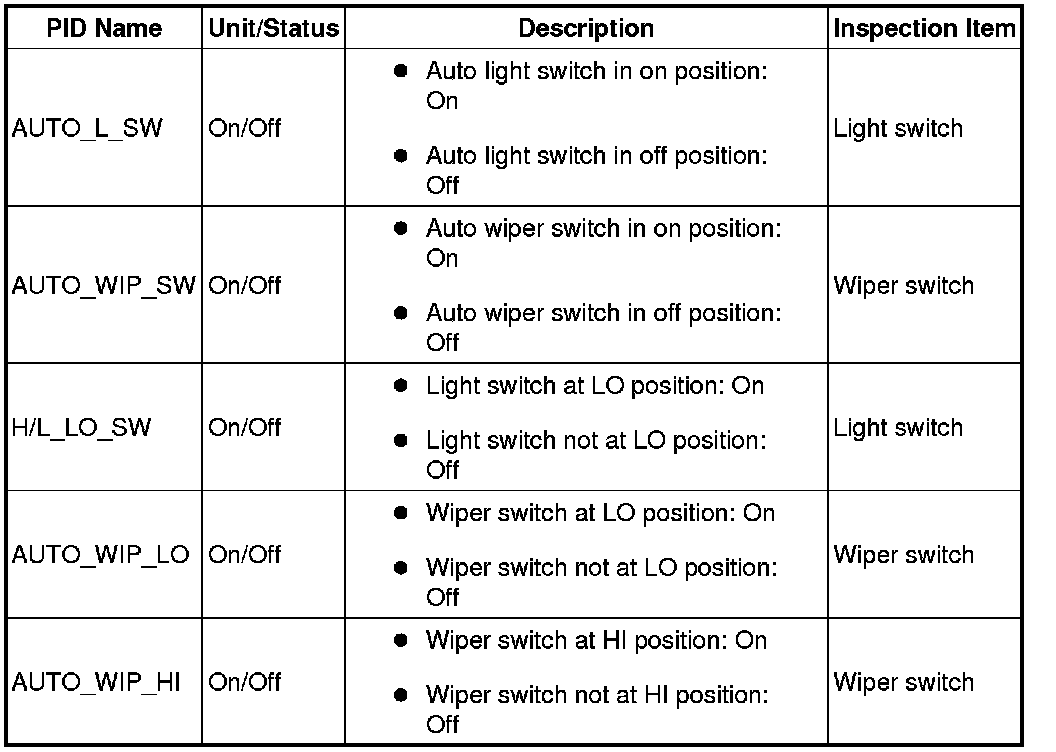 PID/DATA MONITOR TABLE [AUTO LIGHT/