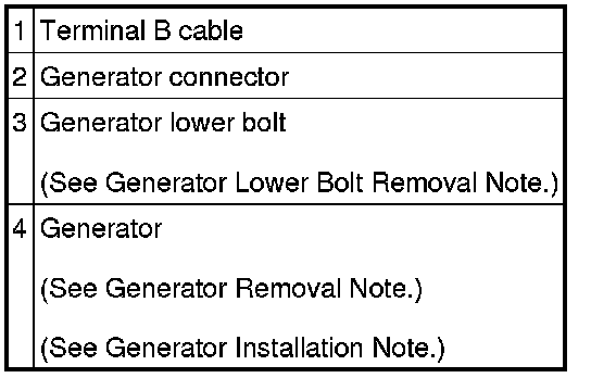 - The generator lower bolt cannot be fully removed from the engine because it contacts the body frame. However, the generator can be removed/installed without fully removing the lower bolt because there is a notch at the lower bolt installation part of the generator.