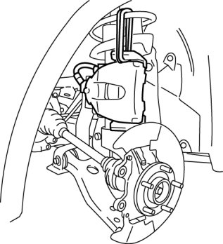1. Remove the brake caliper component from the steering knuckle and suspend it out of the way using a cable.