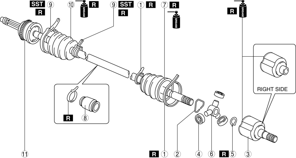 - The wheel side boot does not need to be removed unless replacing it or the ball joint and shaft component.