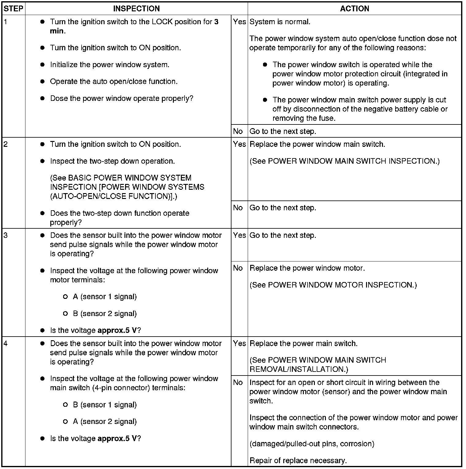 - Perform the following inspection for the power window system component parts of windows where the front door glass cannot be operated automatically.