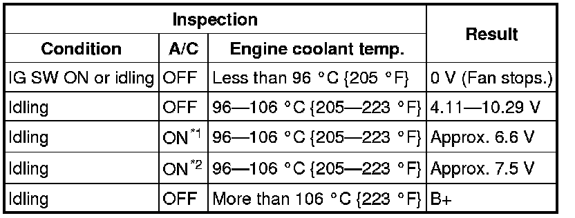 4. Measure the voltage at terminal 2 of the fan control module connector (2 terminals) as shown in the table.