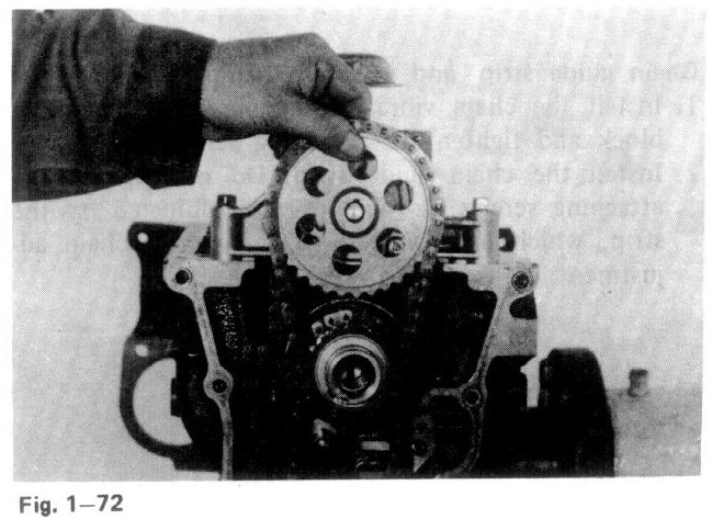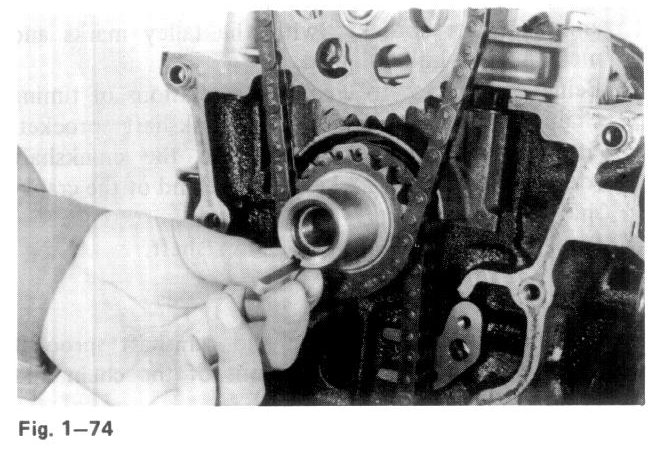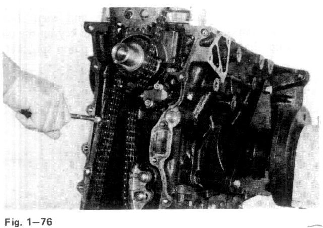 2. Being careful not to change the relations of timing chain, camshaft sprocket and crankshaft sprocket, fit the crankshaft sprocket onto the crankshaft so as to flush the sprocket with the end of the crankshaft.