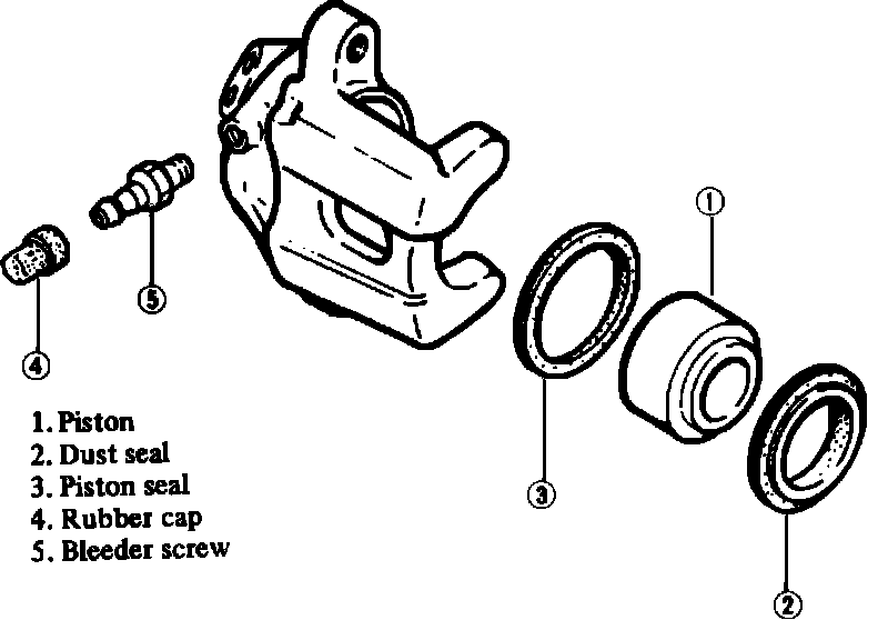 Fig. 4 Disassembled view of front brake caliper components. 1984-85 GLC: