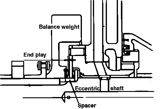 3. Place the bearing housing on the front housing. Tighten the attaching bolts with washers. If the bearing housing has not been removed from the front housing, special care should be taken when installing the spacer, so that the center of the needle bearing in the bearing housing comes to the center of eccentric shaft, and the spacer should be seated to the thrust plate.