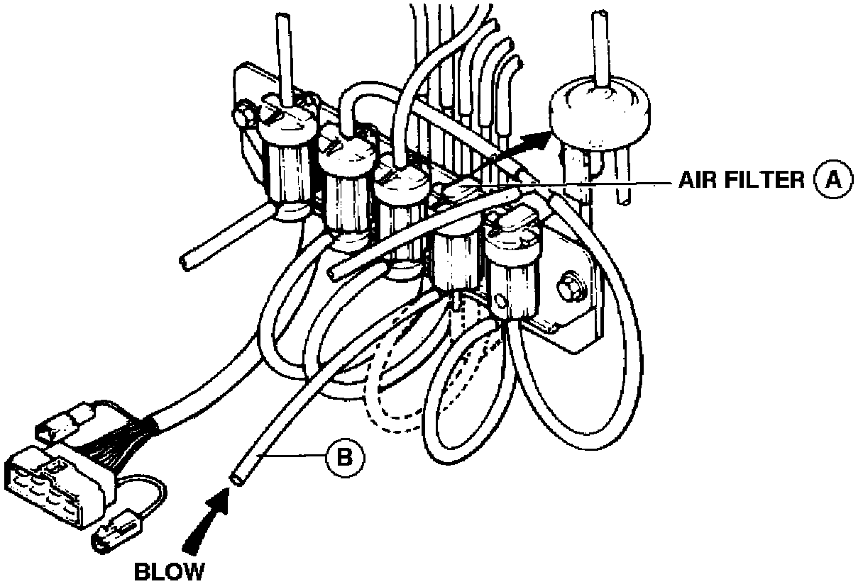 2. Blow air through the solenoid valve from vacuum hose (B), Fig. 40. Ensure air flows through the solenoid valve and out from air filter port (A).