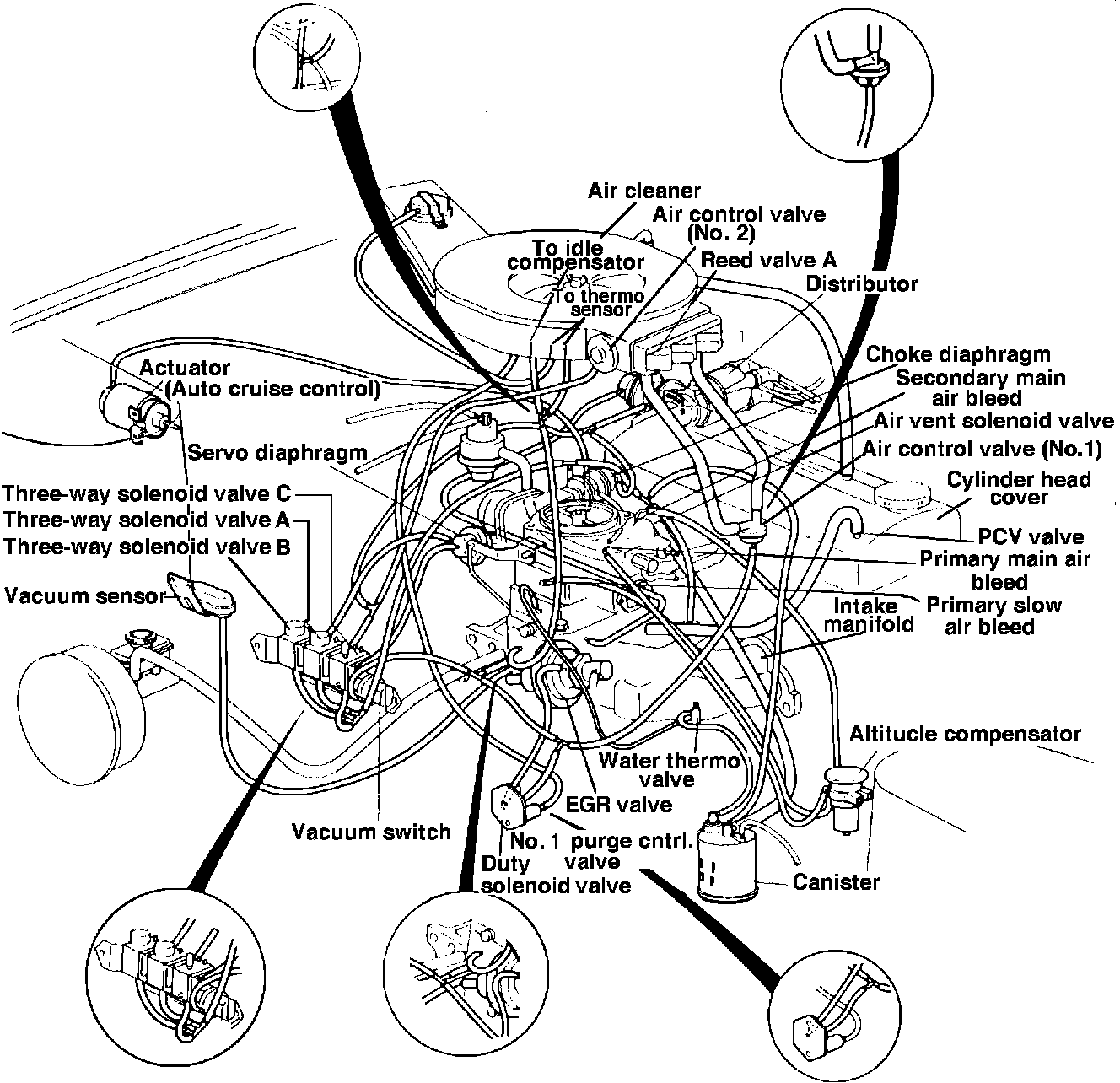 A vacuum leak to the vacuum switch or vacuum sensor will cause fixed duty 0. A vacuum leak at any other location will result in either fixed duty 26~ and Code 5 on the System Checker or low duty readings (5~ - 30~), depending on the severity of the leak.