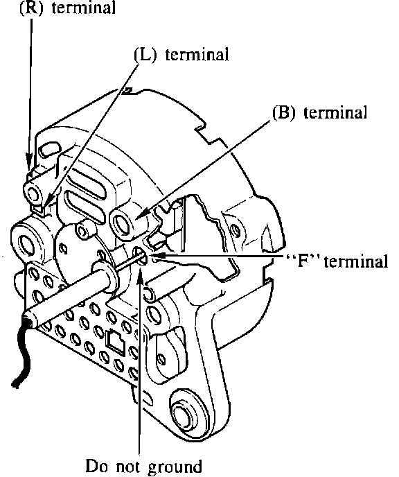 b. Do not ground to the body of the alternator while positive probe of volt meter is inserted through the hole for "F" terminal.