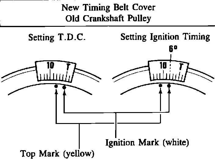 The timing mark on both the timing belt cover and crankshaft pulley has been changed as shown in the illustration below since the production date of October, 1983. The reason for this change is for common use of the parts with other models. Because of this change, the way to use the timing mark has also been changed.