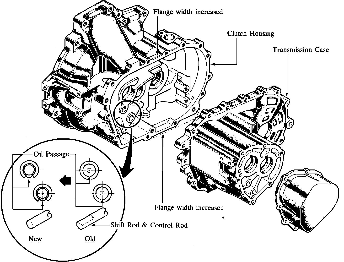 2. The position of the oil escape passage has been changed from the shift rod and control rod side to the transmission case side..