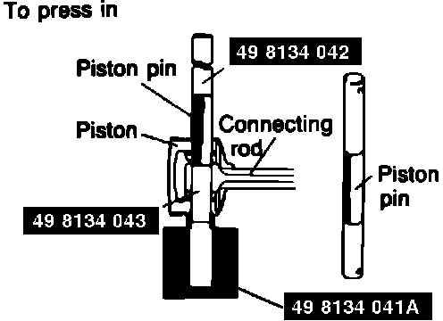 6. The piston pin should be pressed inward until the lower end of guide 498134044 meets the bottom of block 498134041A. Do not exceed 3300 lbs. When pressing pin into piston.