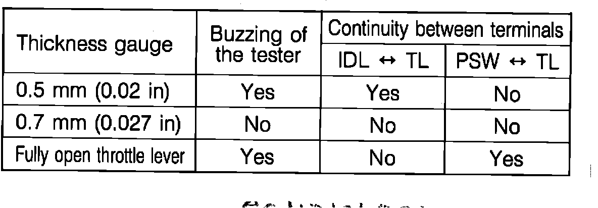 b. Insert .027 inch thickness gage between throttle stop screw and stop lever and ensure there is no continuity between center and top or between center and bottom terminals of throttle sensor .