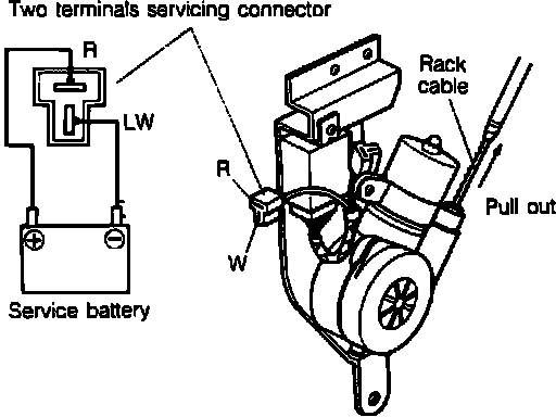 6. To operate motor, supply battery power to motor connector terminals "R" and "W" as shown on image. Then, lightly pull rack cable from motor housing. The motor can also be operated by turning the radio "ON."