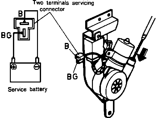 10. To operate motor, supply battery power to motor connector terminals as shown on image. Feed rack cable into the motor while it is running. Ensure that the cable winds neatly into the motor.