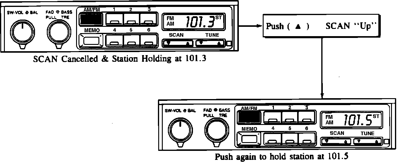 Push SCAN "up" (triangle up symbol)... scan pauses at 101.3 but is trying to receive 101.5. Result is poor reception. If the customer pushes SCAN button again at this point to hold the station, tuner will remain at 101.3 and reception remains poor. If SCAN is pushed again to continue, scan pauses at 101.5 and reception is good.
