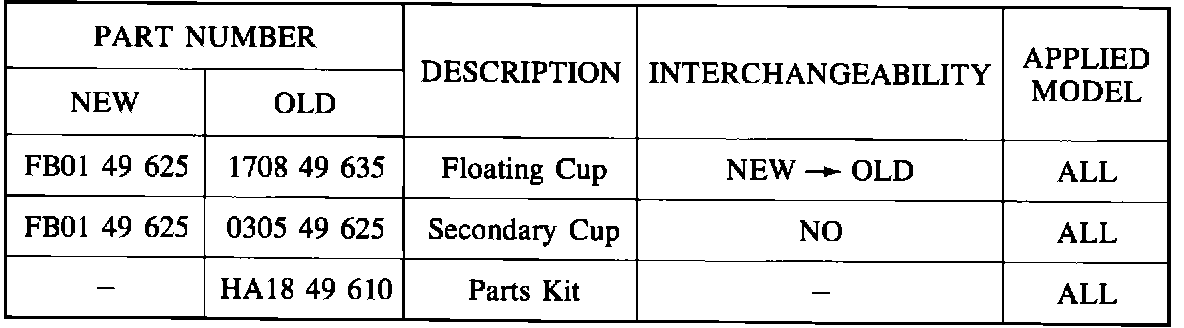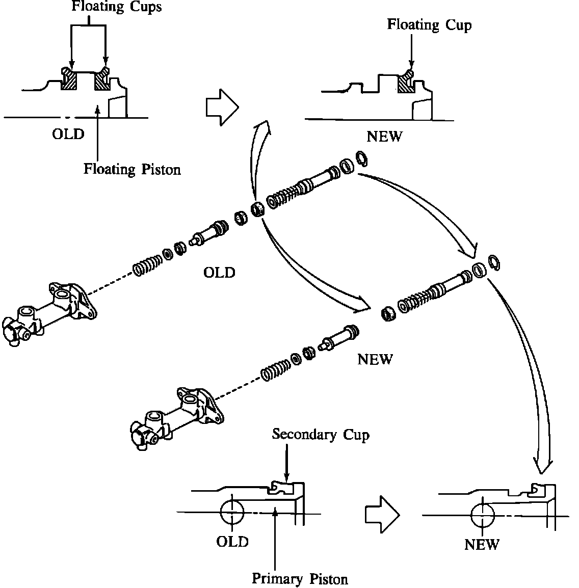 In order to ease the assembly of the brake master cylinder, the quantity of floating cups has been changed from 2 to 1 and the configuration of the secondary cup has been changed so that it is standardized with the floating cup. This change has been made since the production of March, 1987.