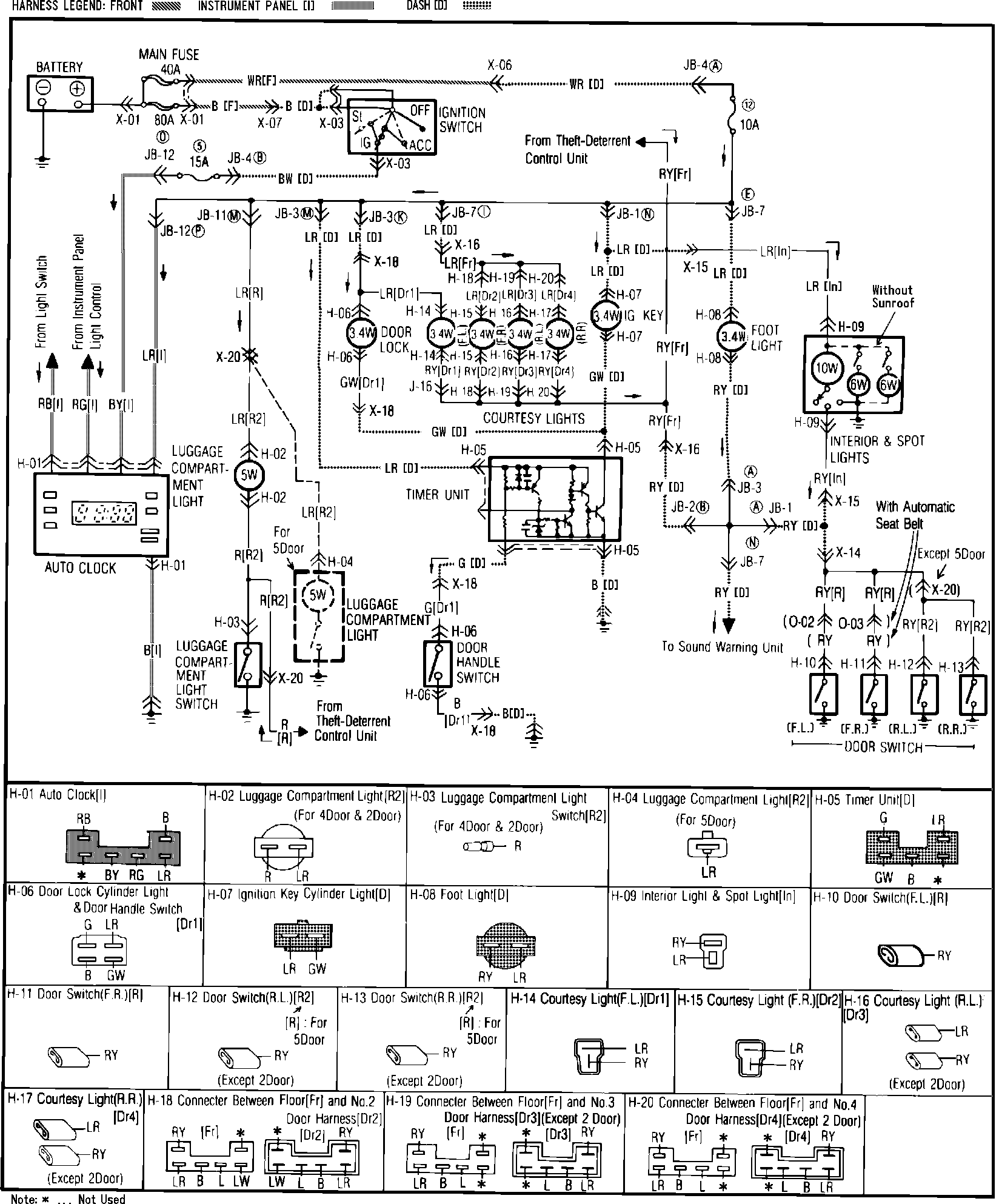 Fig. 44 Clock, Luggage Compartment Light, Ignition Key & Door Lock Cylinder Lights, Courtesy, Footlight, Interior & Spotlights Wiring Circuit: