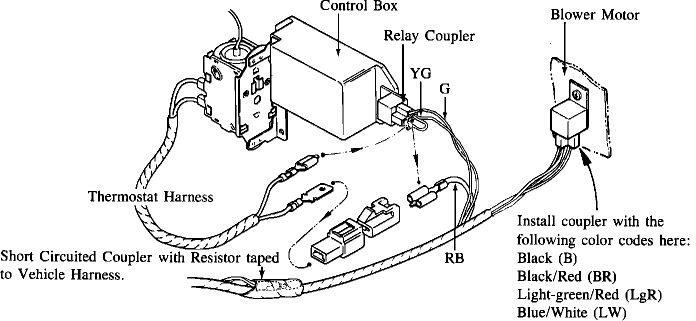 This relay coupler may be located on a relay which is installed onto the blower motor. If so, remove this coupler and install the coupler which is located next to the control box. (See illustration next page).