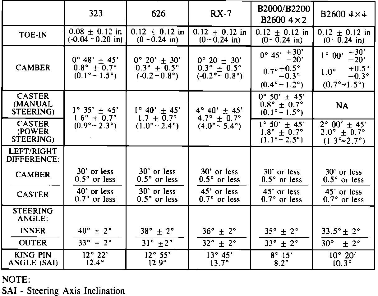 Many of the new computerized four-wheel alignment systems use decimal degrees instead of degrees and minutes as shown in the workshop manuals. For your convenience, front and rear wheel alignment specifications for 1987 vehicles are shown in both units.. Minimum and maximum limits are shown in parenthesis.