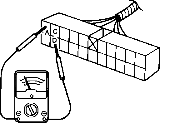 3. Connect ohmmeter to terminals C and D, Fig. 22. With steering wheel in neutral position, meter should indicate 50k ohms.