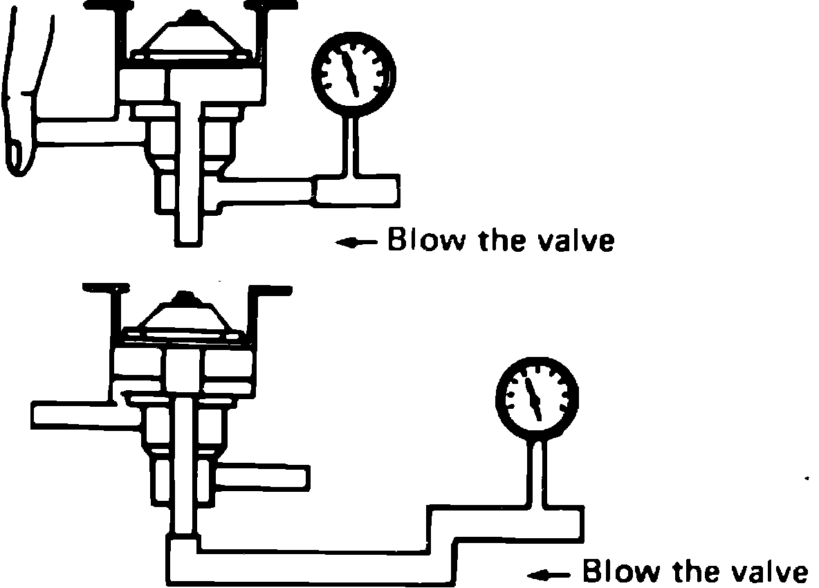 4. Remove pressure gauge and connect to atmosphere passage. Blow air through valve. (Valve should open with .78-1.00 psi pressure applied on 1986 B2000 models) or .14-.71 psi pressure applied on all other models.