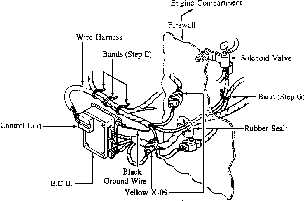 F. Pass the remaining one end of the wire harness through the rubber seal in the firewall and connect it to the solenoid valve which was installed in step 2.