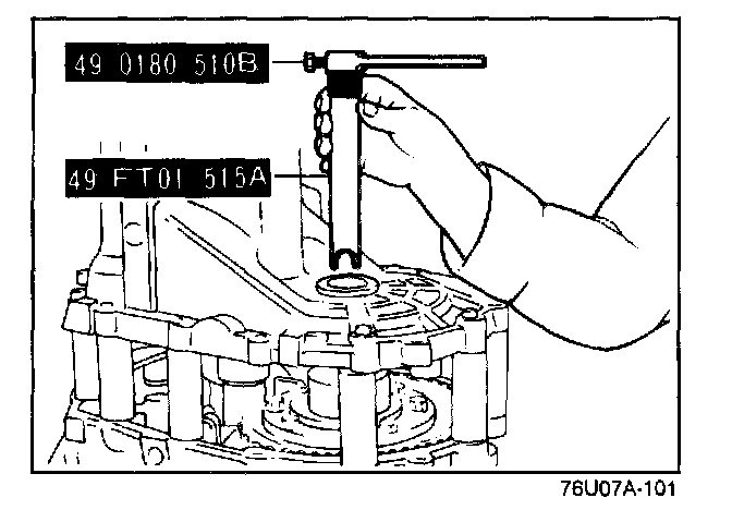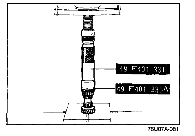 14. The body (49 F401 331) and attachment B (49 F401 336B) of the bearing installer in place on the bearing inner race, and press in the bearing inner race and 4th gear at the same time.