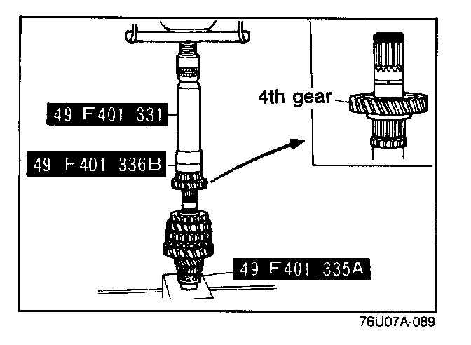 1. After supporting 2nd gear, press on the bearing outer race (engine side) using the body (49 F401 331) and attachment A (49 F401 335A) of the bearing installer.