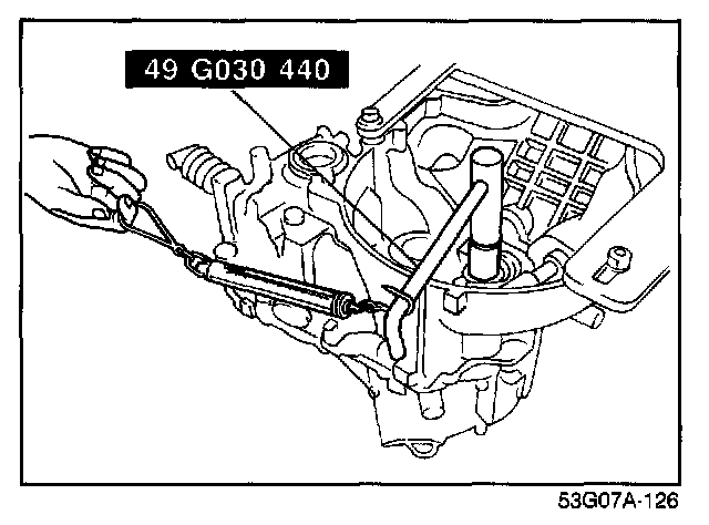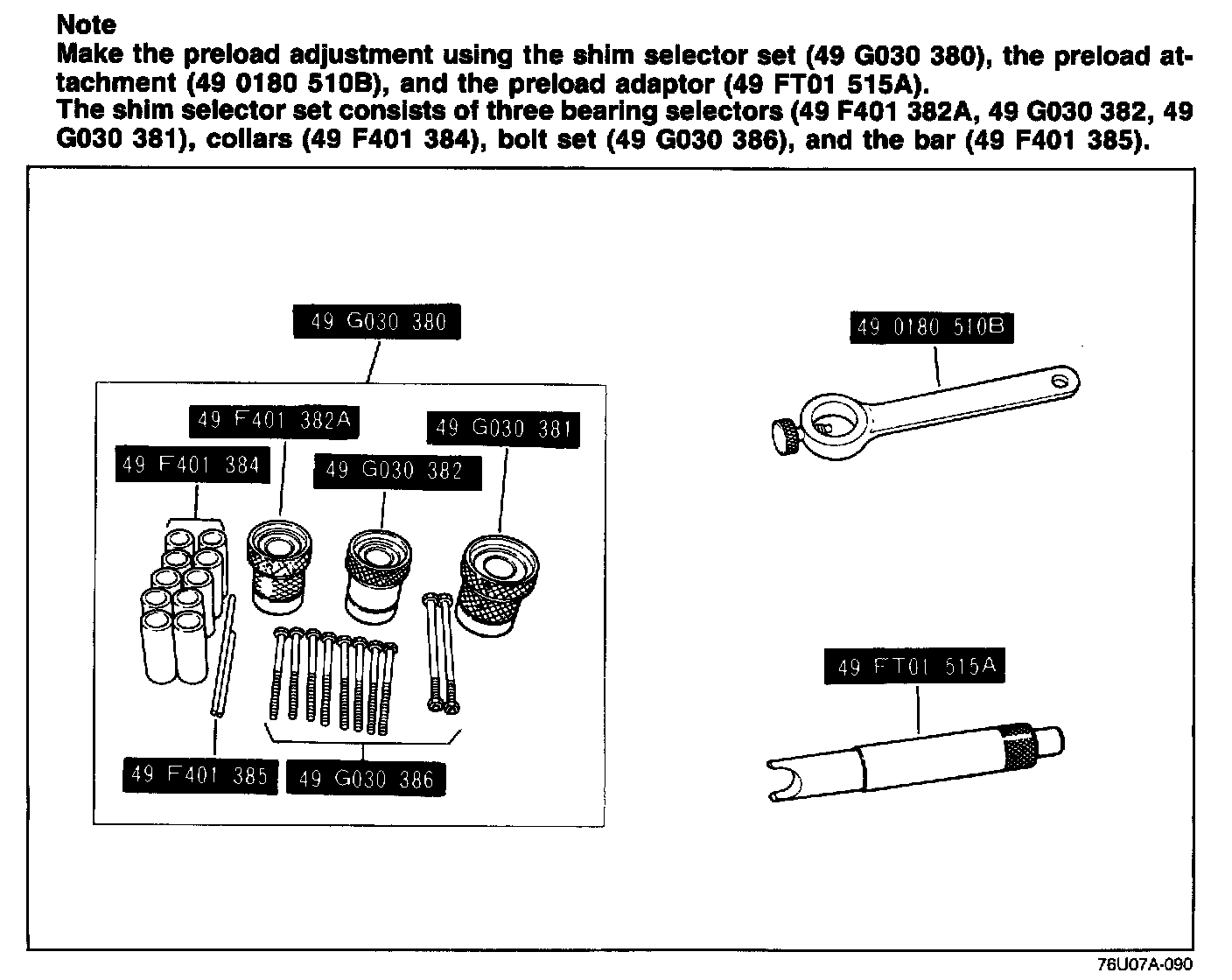 16. Hook a spring scale on the preload attachment (49 0180 510B), and pull the scale to turn the attachment. Adjust the selector with the bars (49 F401 385) until the preload specification is obtained.
