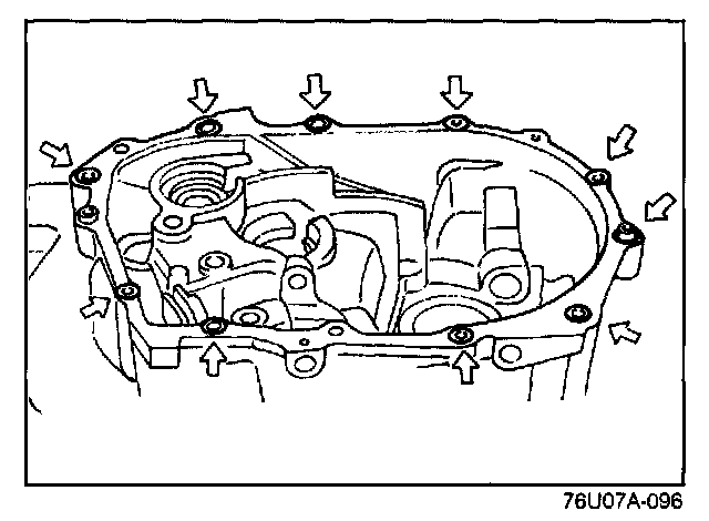 14. After applying a thin coating of sealant to the contact surfaces of the clutch housing and transmission case, tighten the transaxle case installation bolts to the specified torque.