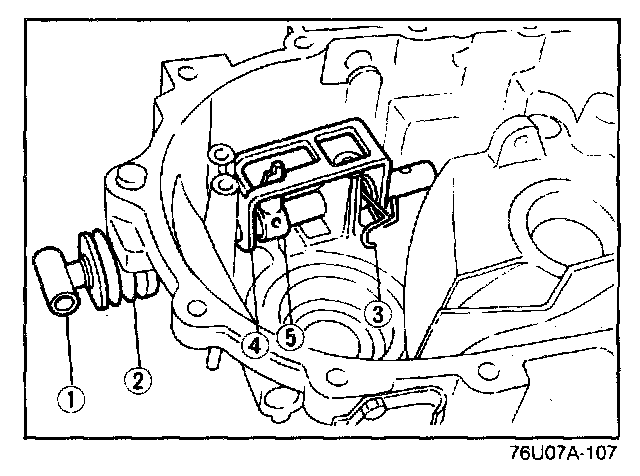 8. Install the change rod (1), the boot (2), the spring (3), the reverse gate (4), and the selector (5) as shown.