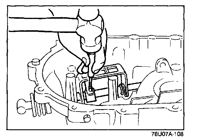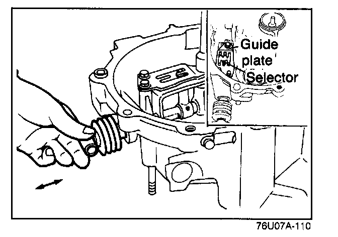 13. Push and pull the change rod and move the guide plate so that the selector moves smoothly in the groove of the guide plate. And tighten the guide plate mounting bolts.