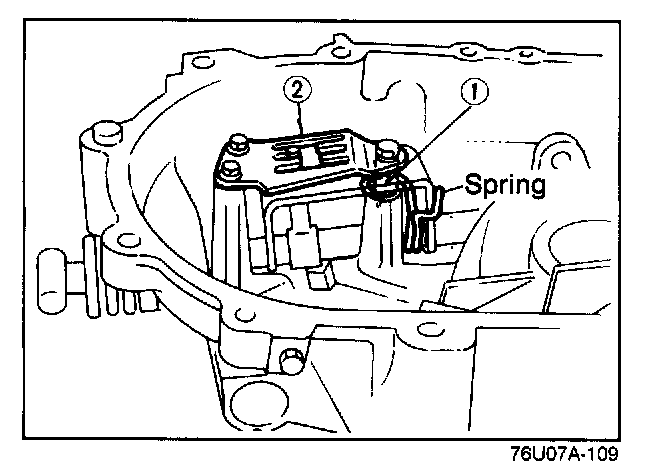 8. Align the shift fork and shift rod spring pin holes, tap in the spring pin (1), and install the stopper plate (2) on top of the clutch hub.