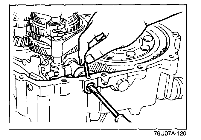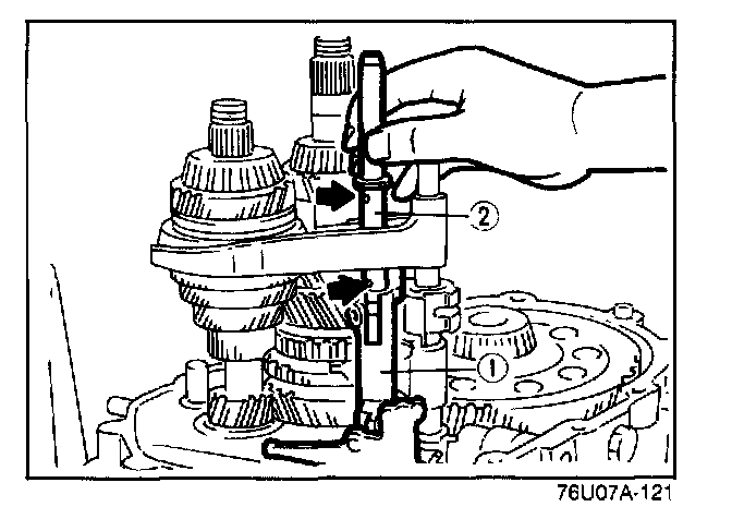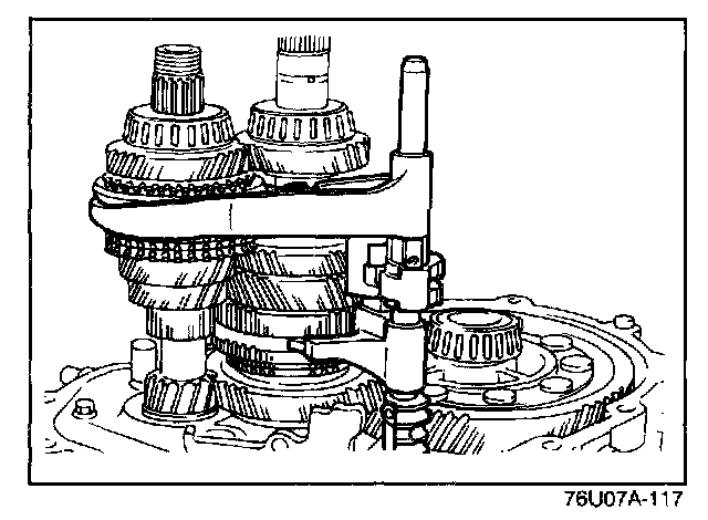 2. Shift the clutch hub sleeve (secondary shaft gear) to 2nd gear and the clutch hub sleeve (primary shaft gear) to 4th gear.