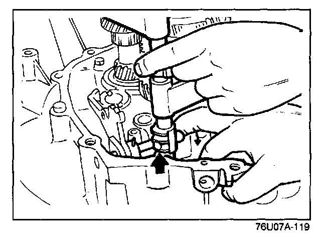 5. With the edge of the control end against the knife, when the control end is pushed in the direction of the arrow in the image so that the ball goes into the shaft, the rod will at the same time line up with the shift rod coupling hole in the clutch housing.