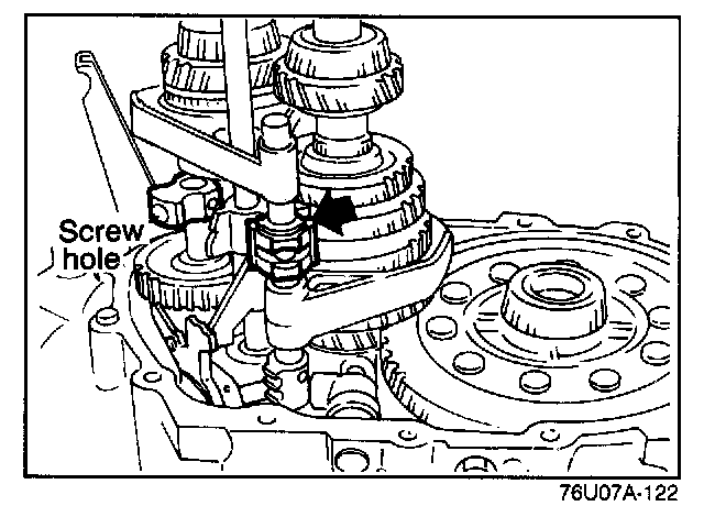 13. Align the end of the interlock sleeve with the control lever indicated by the arrow, and, at the same time, face the reverse idle shaft screw hole in the direction shown in the image.