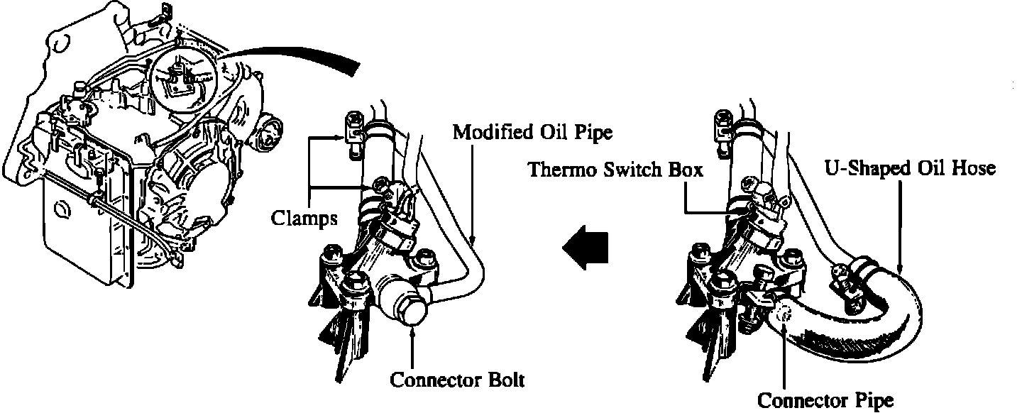 The "U"-shaped oil hose and connector pipe at the thermo switch box have been replaced with an oil line as shown below.