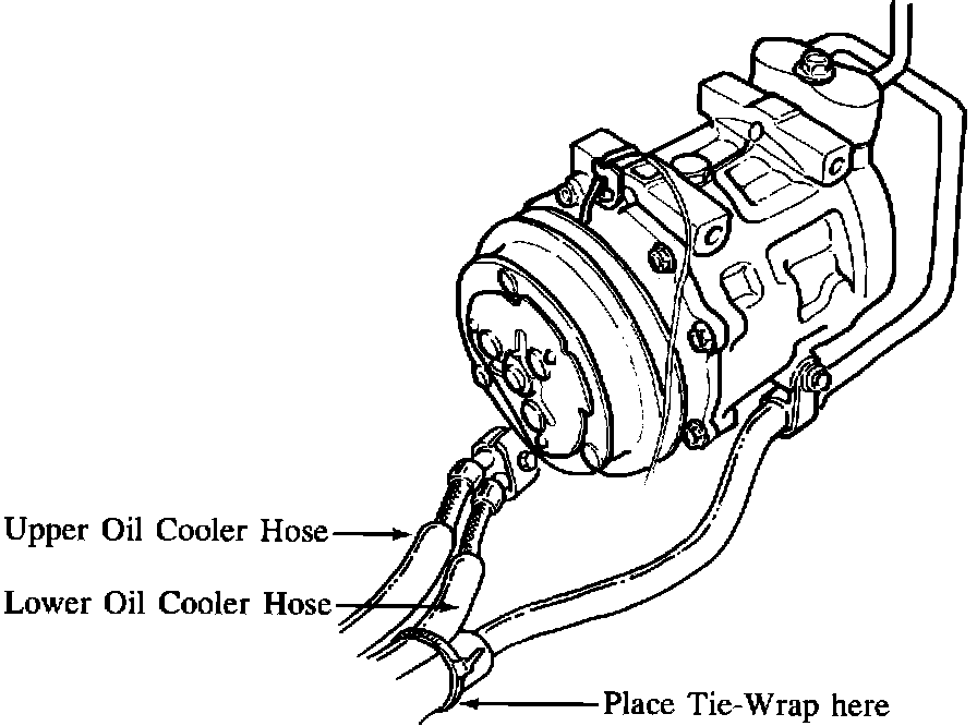 * When installing Air Conditioning kits on RX-7 vehicles, be sure that the discharge hose is routed away from the compressor clutch pulley and TIE-WRAPPED TO THE LOWER OIL COOLER HOSE as shown below. Failure to do so may result in the discharge hose rubbing against the compressor clutch pulley which could damage the hose.