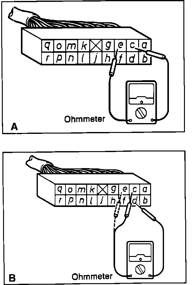 2. Using an ohmmeter, measure the resistance between terminals [c] and [e]. Fig. A Resistance should be: