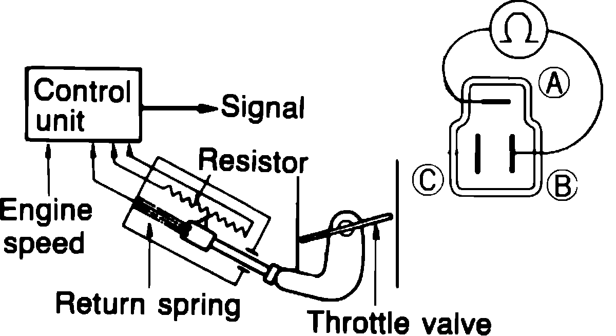 4. Open throttle valve and observe sensor resistance. Resistance between terminals A and B should be approximately 1000 ohms at idle and approximately 4000---6000 ohms with throttle valve fully open. On 1987---88 models, resistance between terminals A and C should be approximately 4000---6000 ohms with throttle valve either fully open or in idle position.