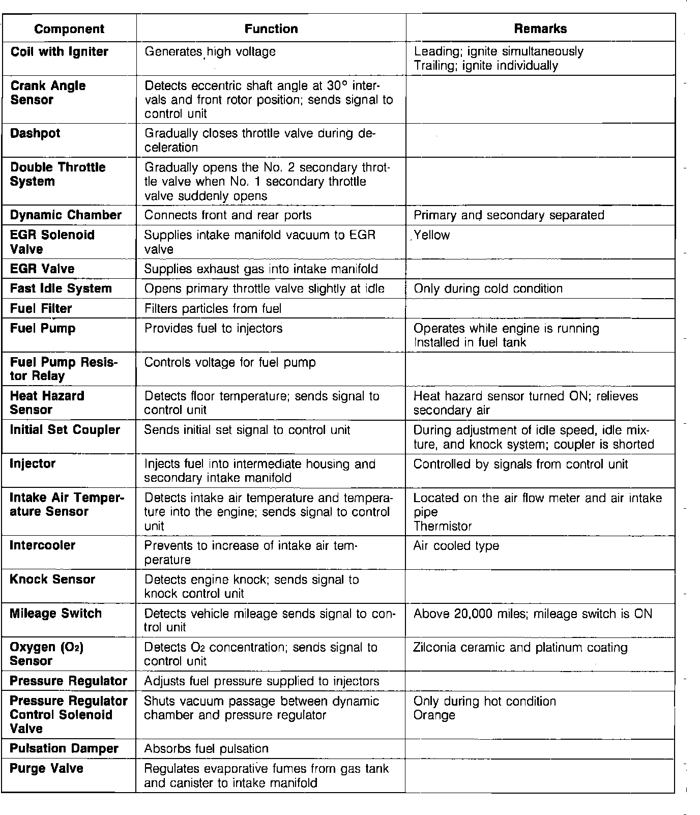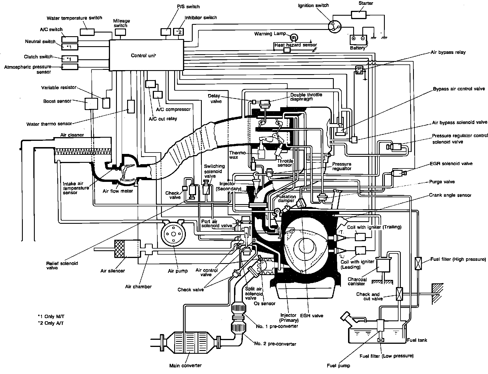 This system, Electronic Gas Injection (EGI) consists of a 3 stage, 6 port variable intake port system, an electric fuel pump, an air flow meter, a pressure regulator, solenoid operated injectors, a control unit, and sensors.