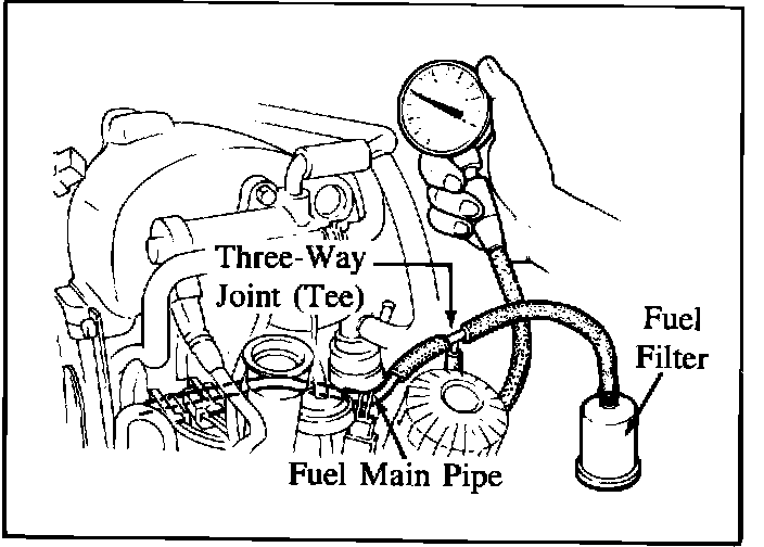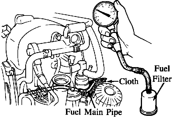 Install a fuel pressure gauge between the fuel filter (high) and the fuel distribution pipe.