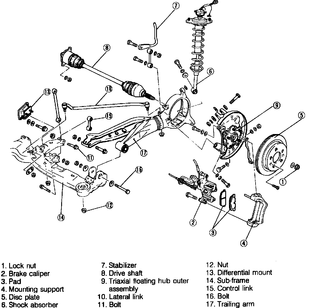 Fig. 7 Exploded view of trailing arm & related components. 1986-88 RX-7: