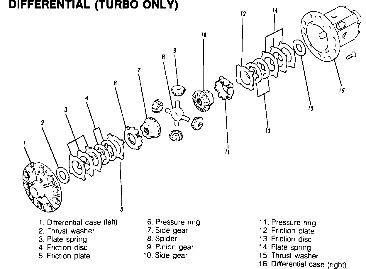 The limited slip differential for the 1987 RX-7 turbo has been changed from the 1986-1987 RX-7 non-turbo. The turbo limited slip differential uses plate springs instead of conical springs to apply pressure on the friction discs and friction plate.. Also, the number of friction plates has been changed.