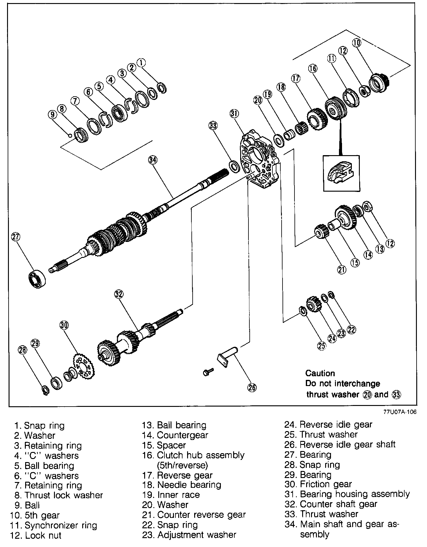 1. Remove the snap ring, washer, retaining ring, and "C" washers, then remove the mainshaft rear bearing using puller (49 0839 425C).
