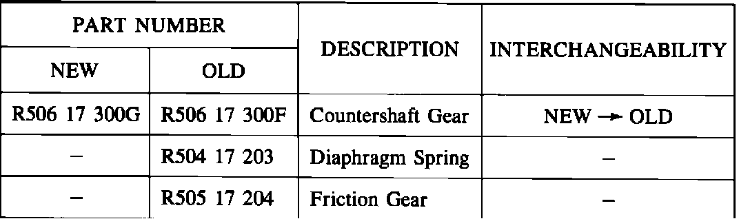 The friction gear and the diaphragm spring have been discontinued since the production of April, 1987 in order to reduce the noise from the countershaft. This noise is similiar to a faulty bearing and occurs only in neutral with the clutch engaged. The modified countershaft is available as a repair part for vehicles with the above noise produced prior to the VIN listed below.